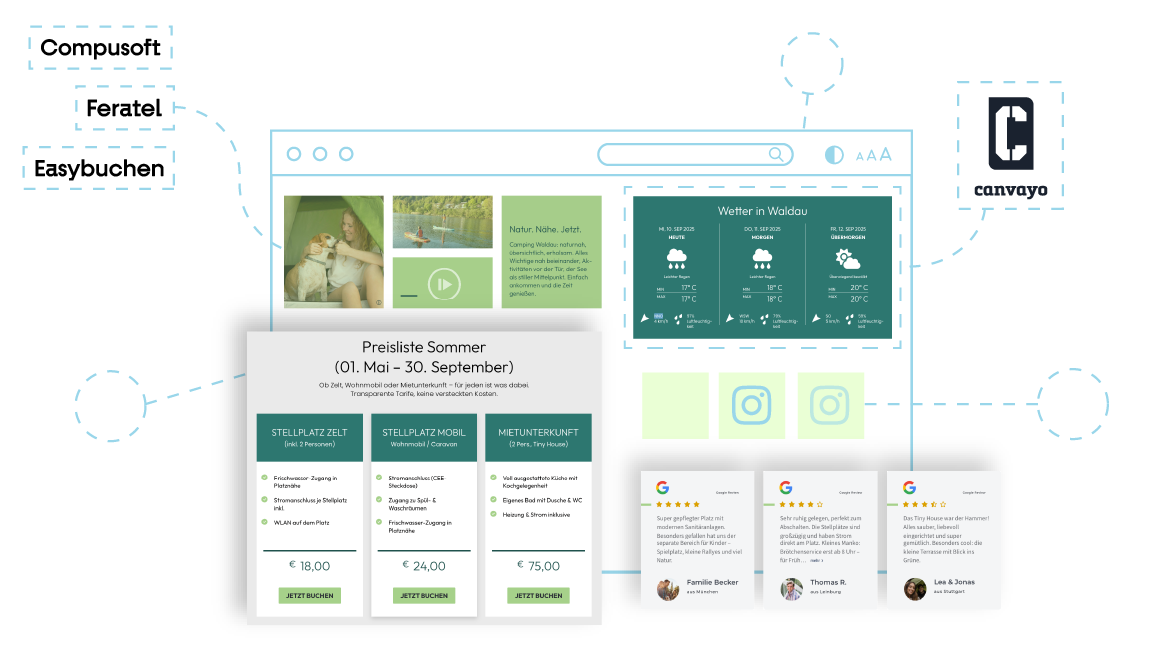 Unsere Website-Lösung CANVAYO ist ausgestattet mit allen Tools für erfolgreiches Online-Marketing, das Ihren Campingplatz nach vorne bringt.